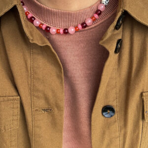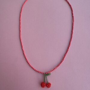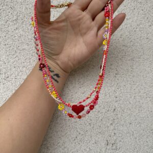 • naszyjnik ze szklanych perełek z ręcznie szytymi sercami i owockami