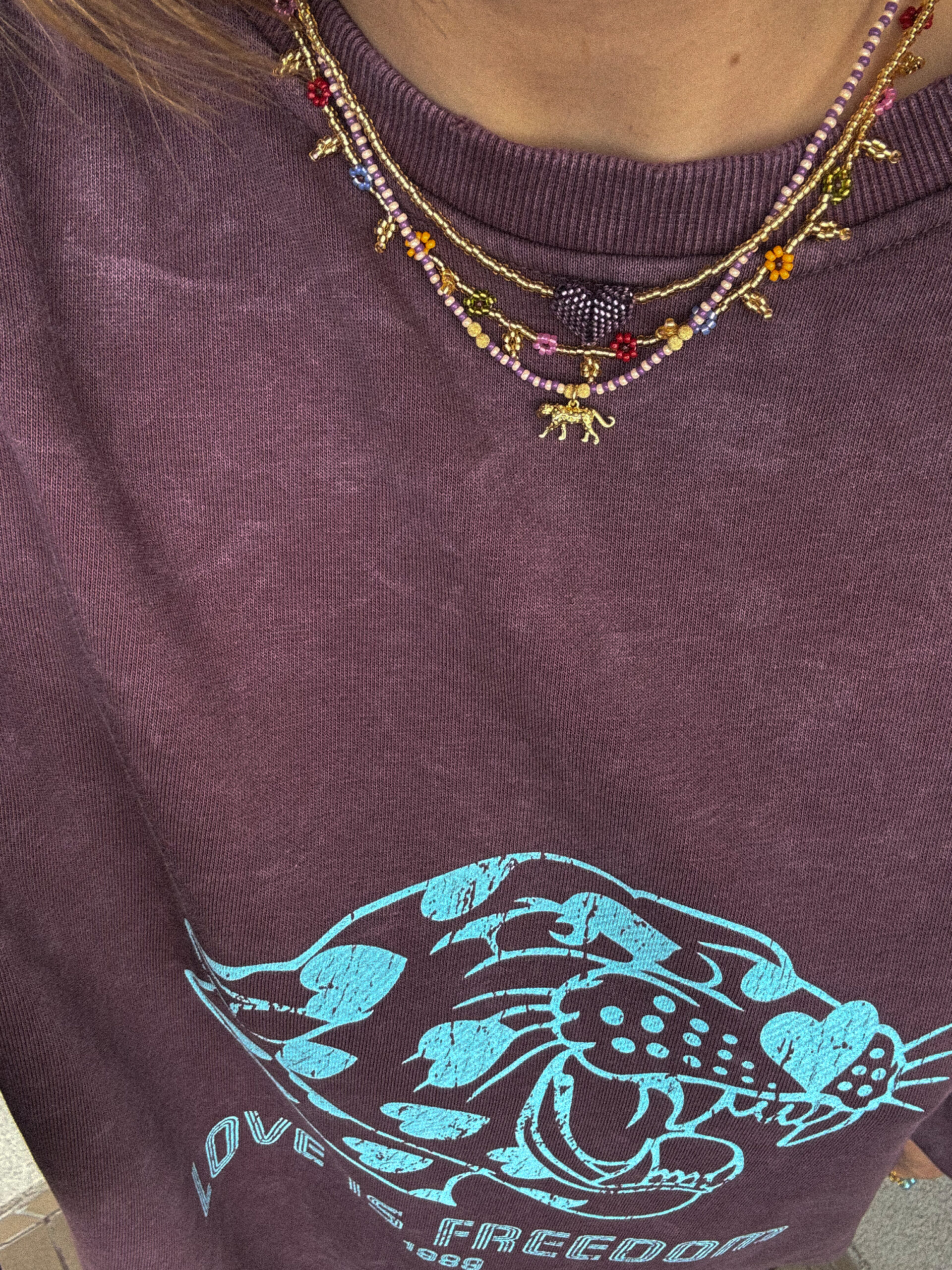 Naszyjnik z gepardem w fiolecie i beżu, uzupełniony złotymi kuleczkami