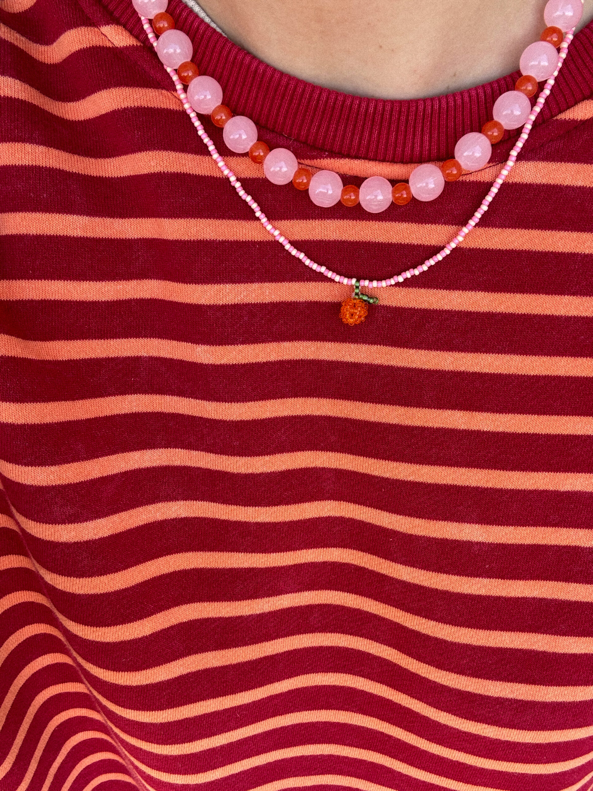 – zawieszka w kształcie pomarańczy na tle różowo-beżowego łańcuszka to ukłon w stronę wakacyjnej lekkości i radości.