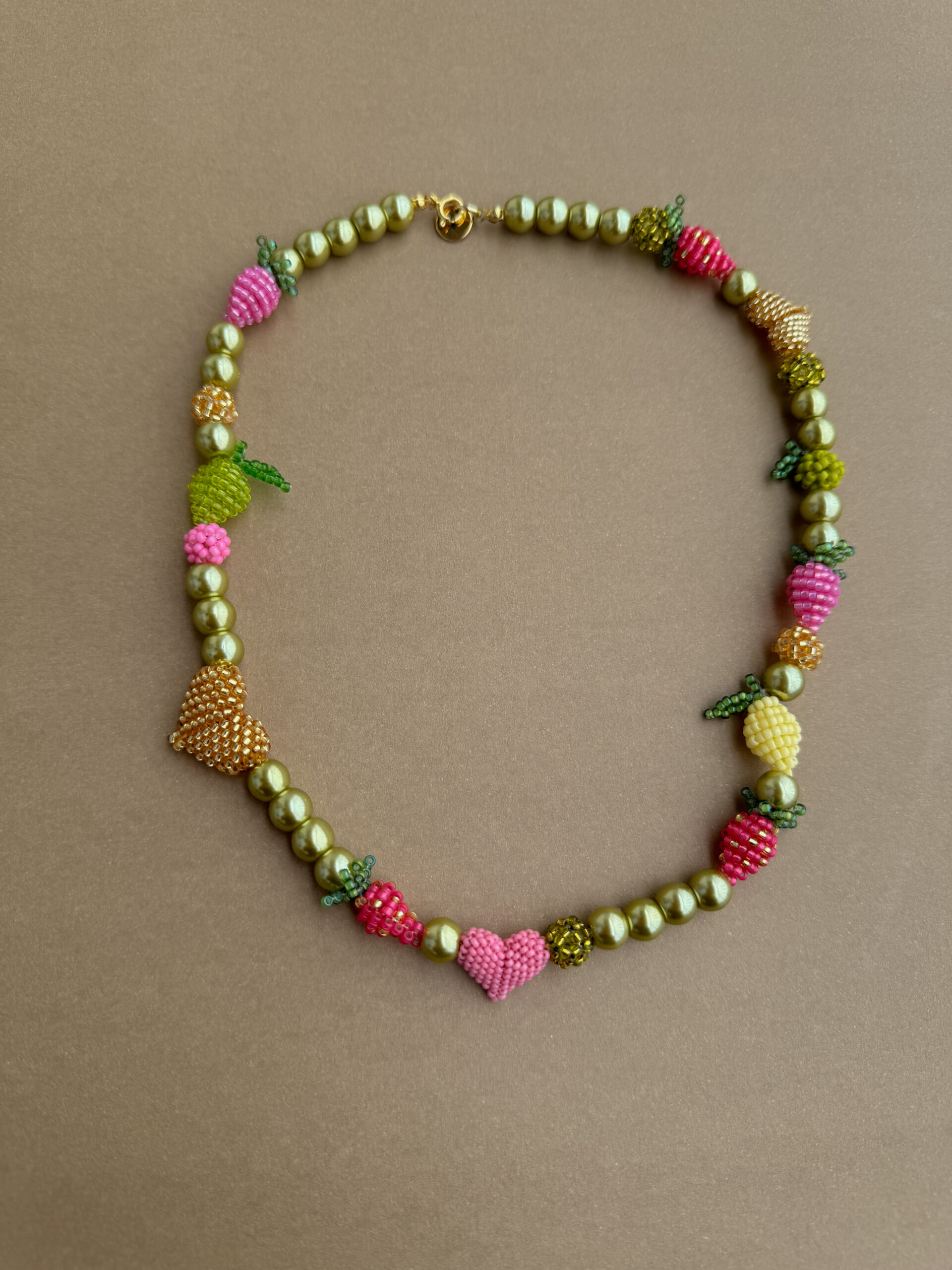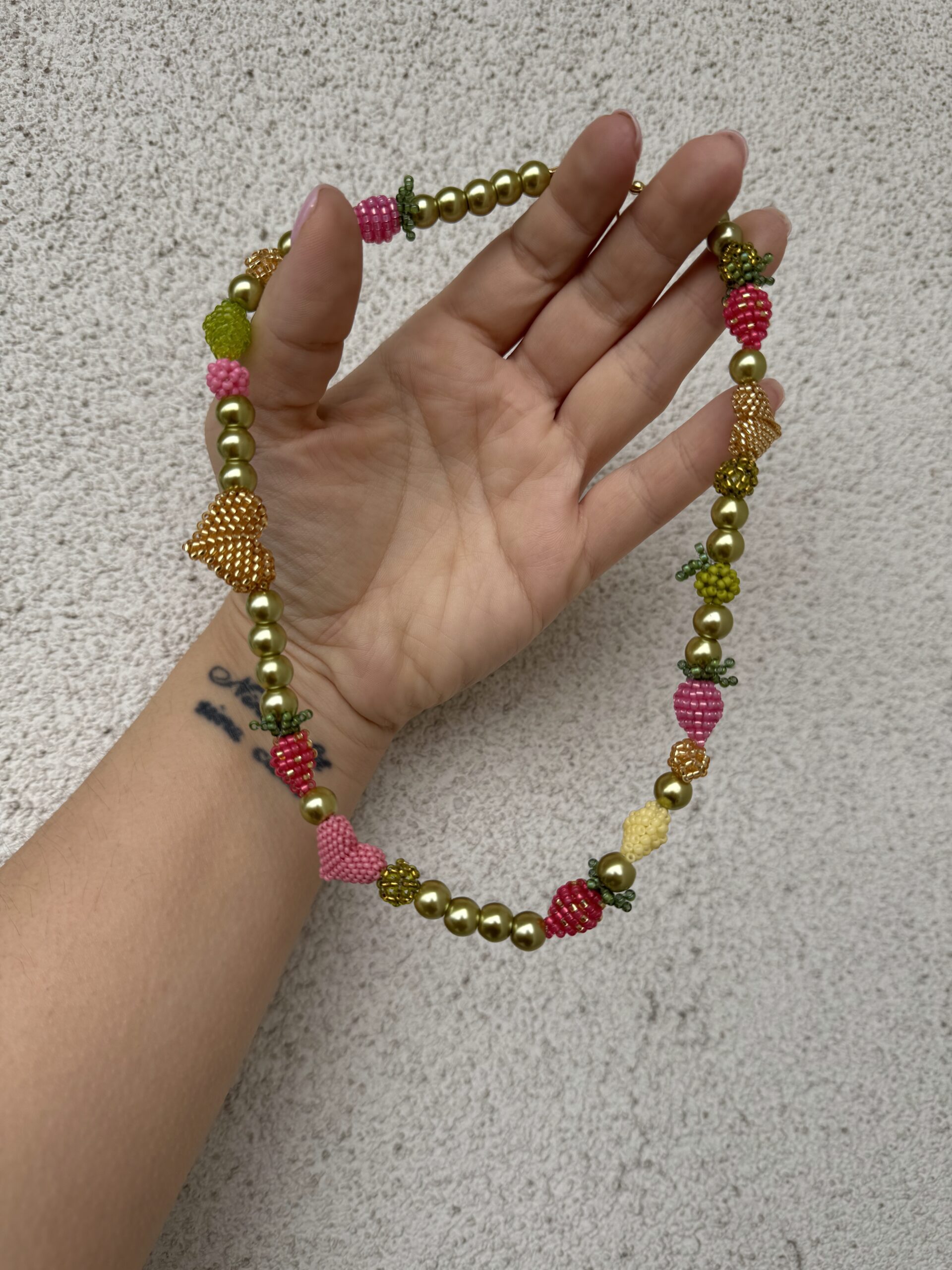 Poznaj prawdziwie unikatowy naszyjnik, który powstał z połączenia pasji, precyzji i wyobraźni! Wykonany z wysokiej jakości szklanych perłowych koralików, zachwyca nie tylko swoim blaskiem, ale przede wszystkim bogactwem ręcznie szytych detali. Każde serduszko, owoc i drobny element to efekt wielu godzin starannej, ręcznej pracy – dzięki temu każdy egzemplarz jest absolutnie niepowtarzalny.