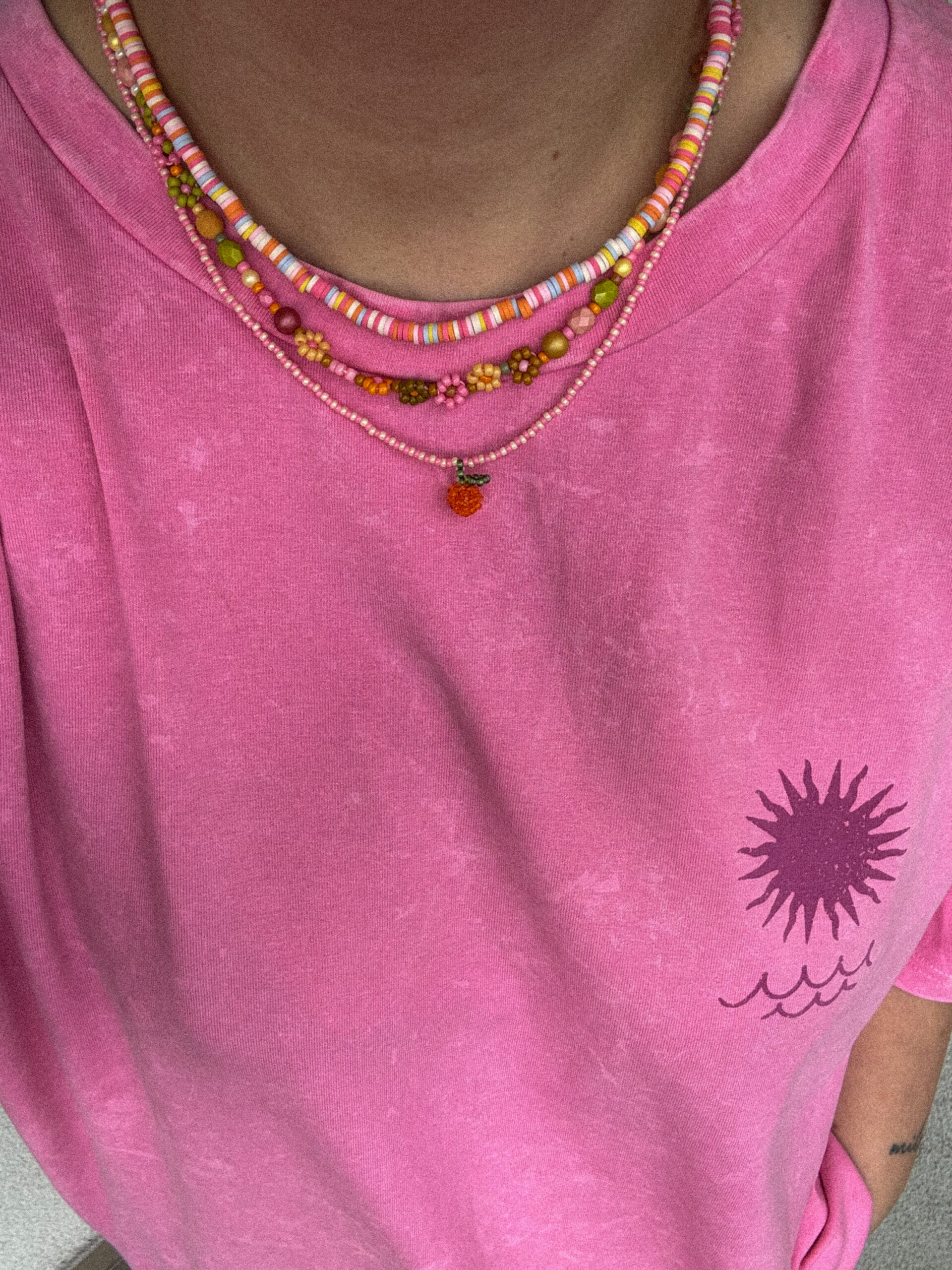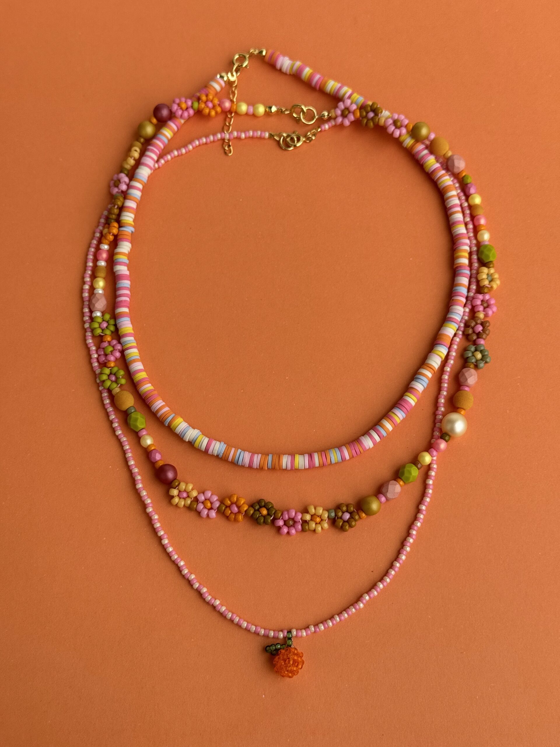 | Długość: | okrągły naszyjnik 42cm, naszyjnik z kwiatuszkami 45cm, naszyjnik z pomarańczką 49cm |